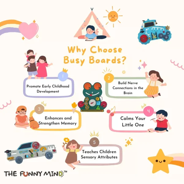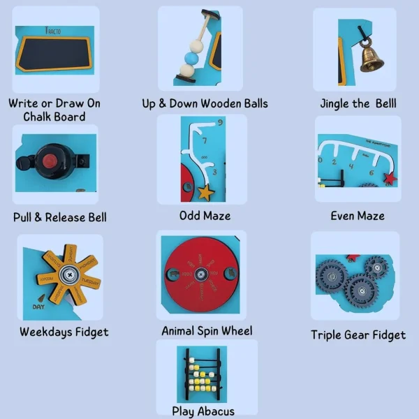 Tracto Busy Board helps in stimulating your young child’s senses: touch, smell, taste, movement, balance, sight and hearing basically their senses are evoked.