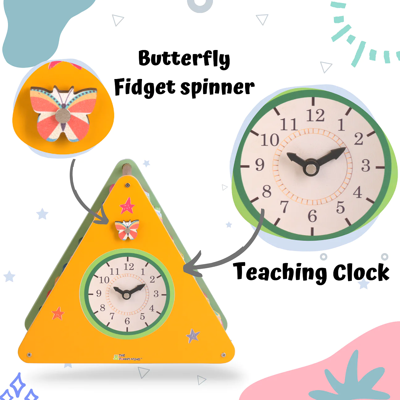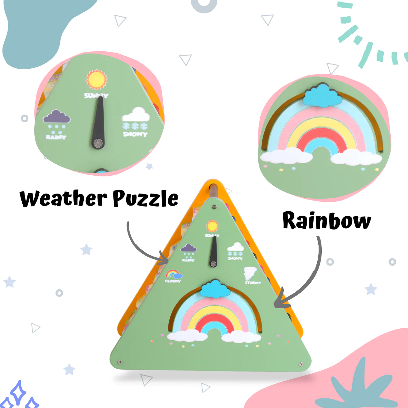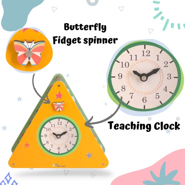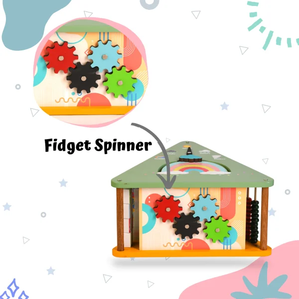 7 IN 1 DIFFERENT ACTIVITIES LARGE WOODEN TRIANGLE: This product is perfect for kids who love to learn and play! The 7 in 1 different activity large wooden triangle with an abacus bead maze, clock, alphabets associated characters, fidget spinner, butterfly fidget spinner and weather puzzle is a great way to keep them entertained while they learn important skills. They can play with the bead maze, spin the fidget spinner, solve the weather puzzle, and more.